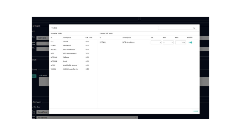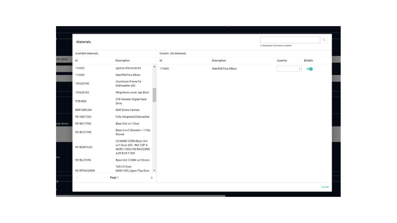 Drag-and-drop functionality is available during call creation for operations and materials. Any labor rates can be changed if required, and parts can also be dragged into the service call.